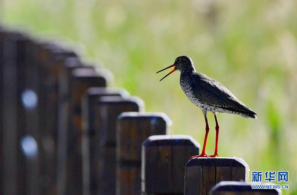 初夏,紅腳鷸在位于西藏拉薩的拉魯濕地國(guó)家級(jí)自然保護(hù)區(qū)內(nèi)起舞覓食。