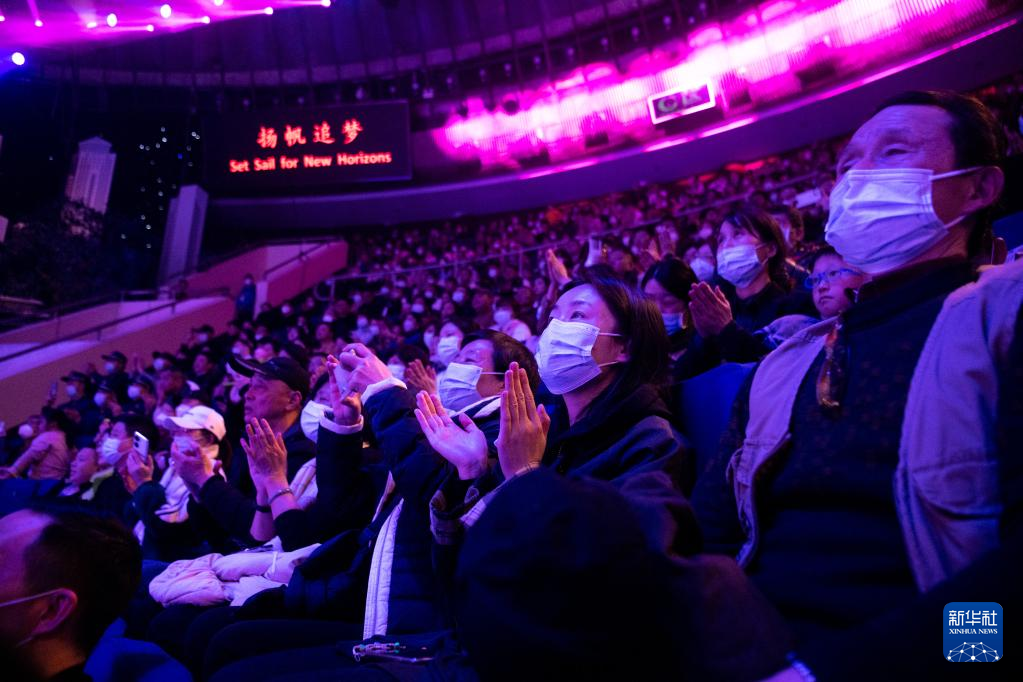 3月24日,观众在第十四届武汉国际杂技艺术节开幕式上观看《英雄之城》。