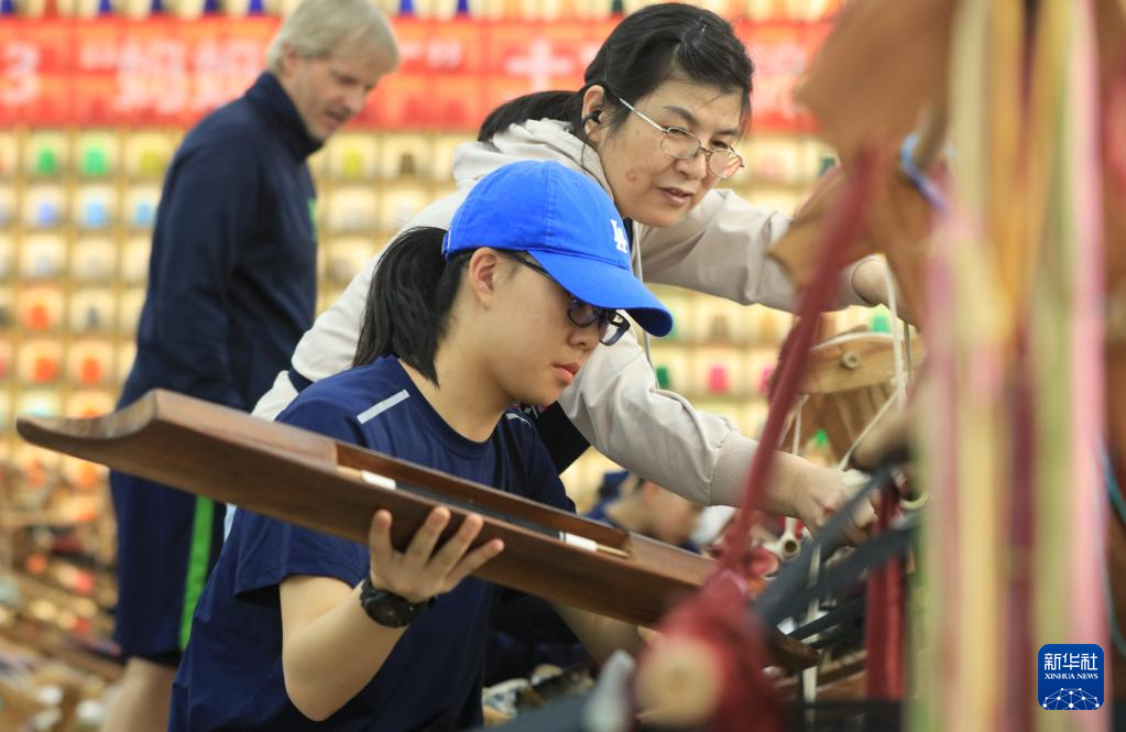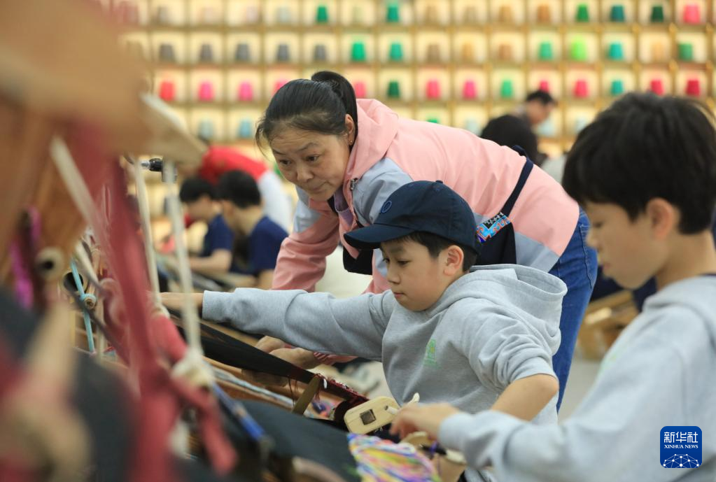 5月12日,来自上海包玉刚实验学校的学生在张家界市武陵源区乖幺妹土家族织锦基地学习体验土家族织锦非遗技艺。
