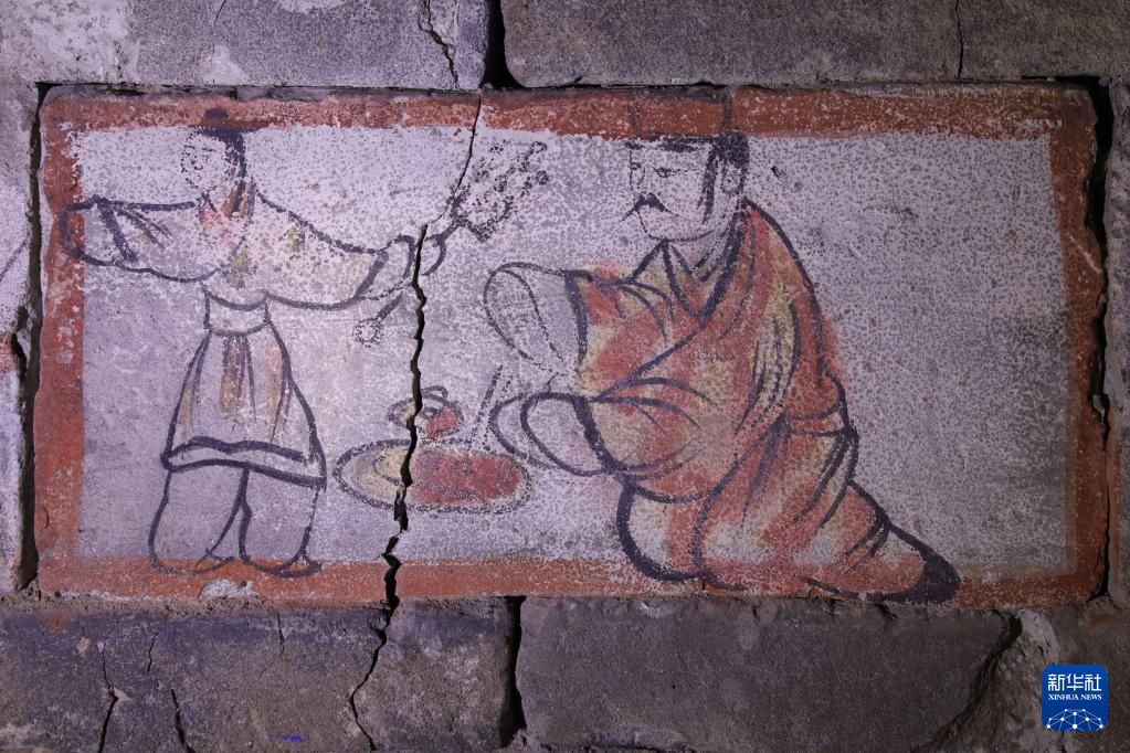 在嘉峪关魏晋墓六号墓的画像砖上,绘有男主人宴请宾客的画面,内容表现了仆人在加工烤肉、蒸食物、端着托盘给主人用餐的场景(5月10日摄)。