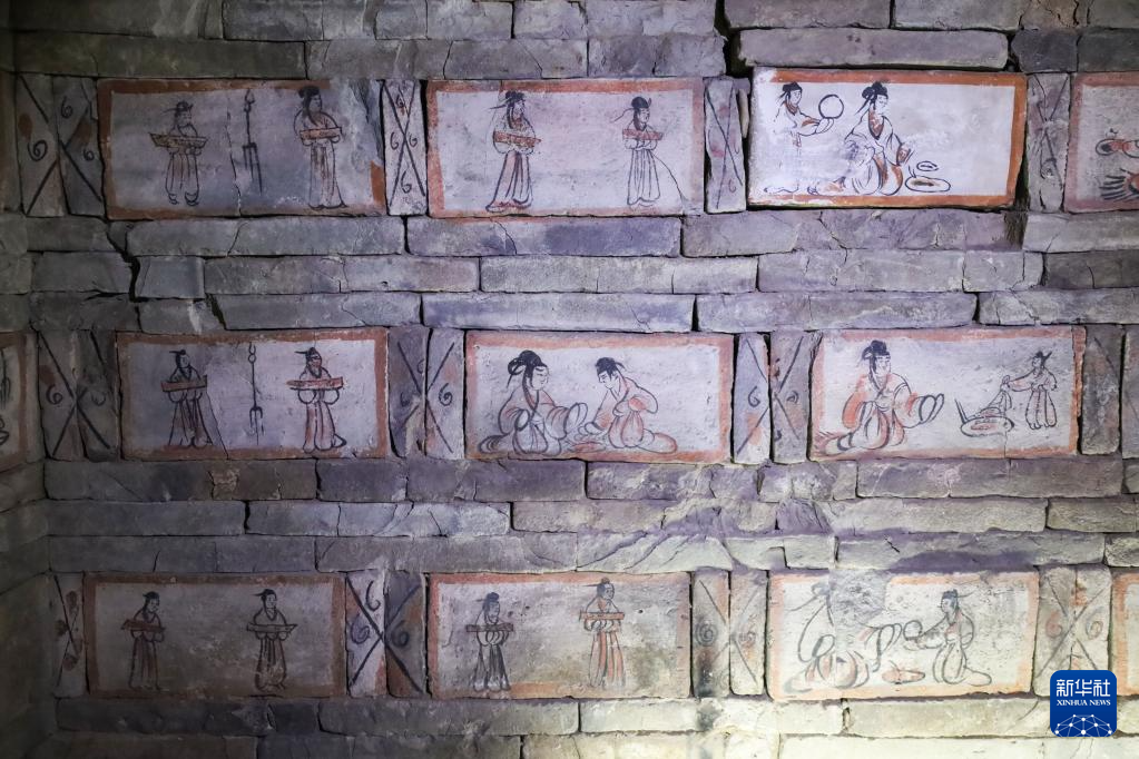 在嘉峪关魏晋墓六号墓的画像砖上,绘有墓葬女主人宴请宾客的场景(5月10日摄)。