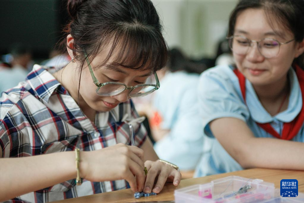 5月30日,张钦玮(左)在上海市青云中学教学生做盘扣。