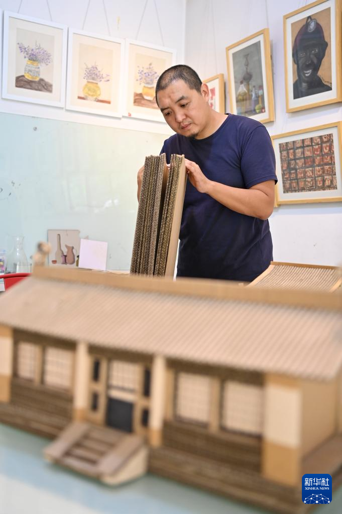 王帅栋在位于山西省太原市万柏林区的工作室内修整瓦楞纸作品(8月1日摄)。