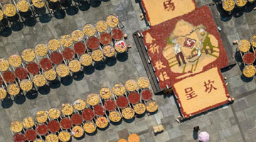 9月13日,江苏省演艺集团昆剧院院长施夏明(左)和江苏省演艺集团昆剧院国家一级演员孔爱萍在法国巴黎卢浮宫金字塔广场上参加昆曲快闪。