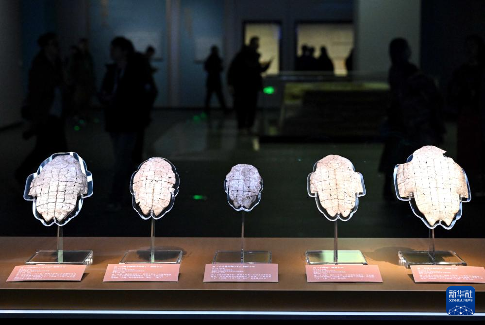 2月26日,参观者在河南安阳殷墟博物馆新馆内观看展出的刻辞卜甲。