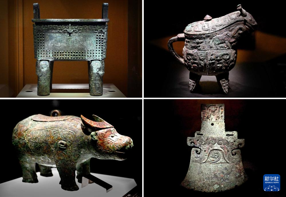 这是河南安阳殷墟博物馆新馆内展出的“司母辛”铜鼎(左上)、“亚长”铜觥(右上)、“亚长”牛尊(左下)、“亚长”铜钺(拼版照片,2月23日摄)。