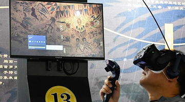 7月22日,游客借助VR设备在莫高窟第285窟虚拟场景中体验擂鼓。