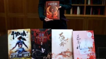 虞金顺在艺术馆介绍自己创作的乐清黄杨木雕作品《中国梦》(11月25日摄)。