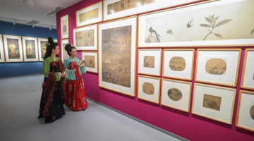 虞金顺(左)在艺术馆展示介绍自己创作的乐清黄杨木雕作品(11月25日摄)。