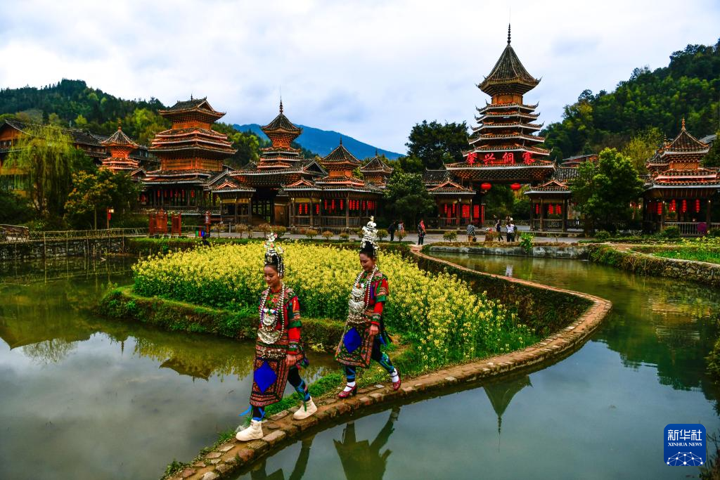 3月17日,侗族姑娘从贵州省黎平县肇兴侗寨寨门外经过。