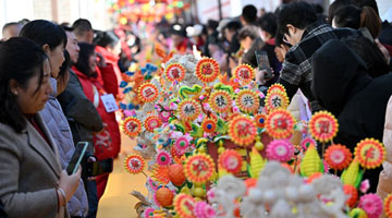 3月14日,在武汉市任炜汉绣工作室,任炜在观看展出的刺绣作品。