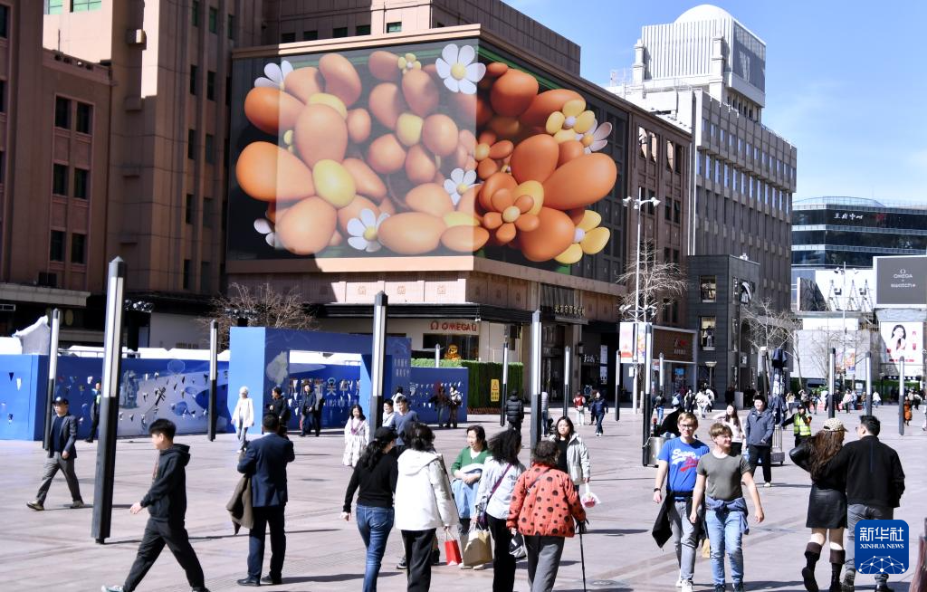 3月20日,人们从北京王府井商业街区的裸眼3D大屏前走过。