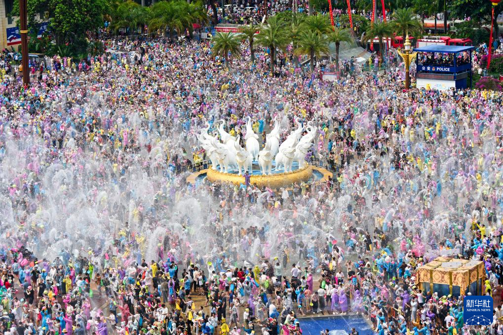 当日,云南多地举行泼水节活动,各族群众和游客用相互泼水的方式互送祝福,庆祝泼水节。