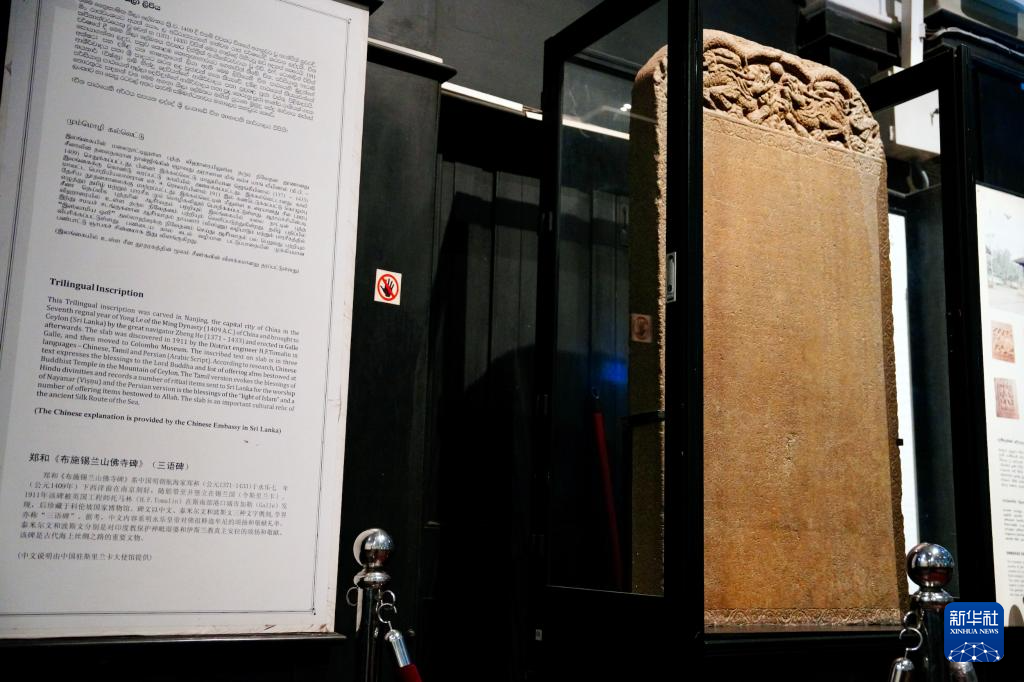 4月17日,郑和遗存《布施锡兰山佛寺碑》(中)在斯里兰卡科伦坡国家博物馆主展厅展出。