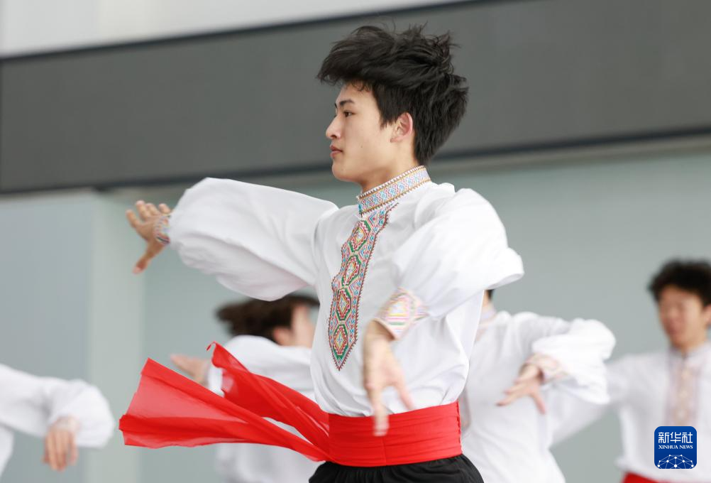 4月14日,罗昊(前)和同学在舞蹈学院专业技能课教室里学习维吾尔族舞蹈。