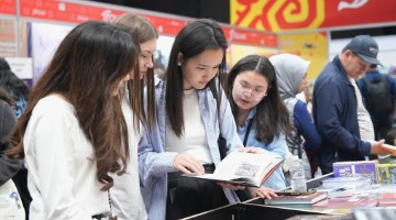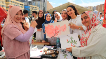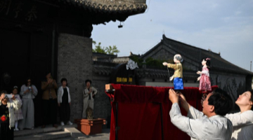 4月28日,在宁乡市炭河古城景区,参与活动的学生(右一)与游客互动。