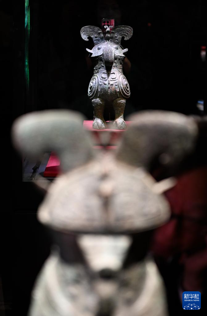 这是5月18日拍摄的“中华文明起源系列展:看·见殷商”展览中一对出土于殷墟妇好墓的鸮尊。这两件鸮尊分别藏于中国国家博物馆(后)和河南博物院。