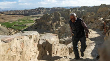 今年77岁的仁增旺扎家住西藏阿里地区札达县东嘎村皮央组。他的家与宏伟壮观的皮央石窟仅咫尺之遥,民居依偎在高耸的石窟群之下,形成了强烈的视觉落差。皮央石窟群与两公里外的东嘎扎西曲林寺遗址一起组成了西藏最大的佛教石窟遗址——皮央和东嘎石窟遗址。