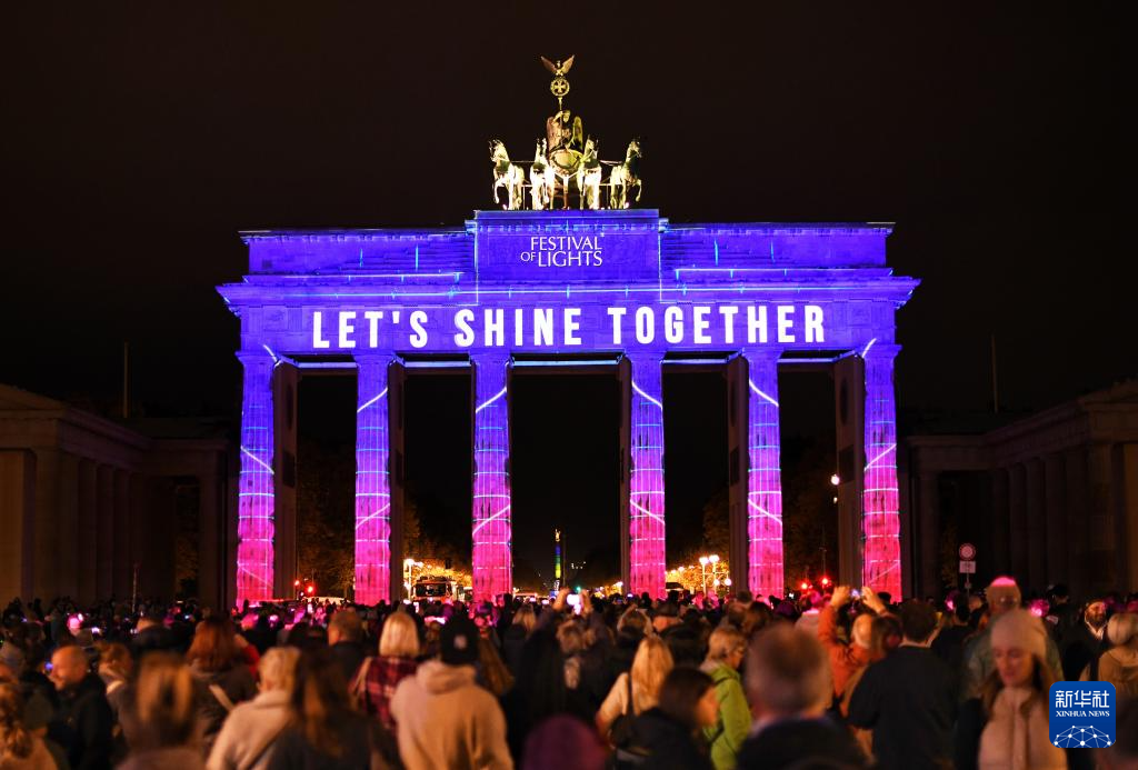 10月9日,德国柏林勃兰登堡门被灯光点亮。