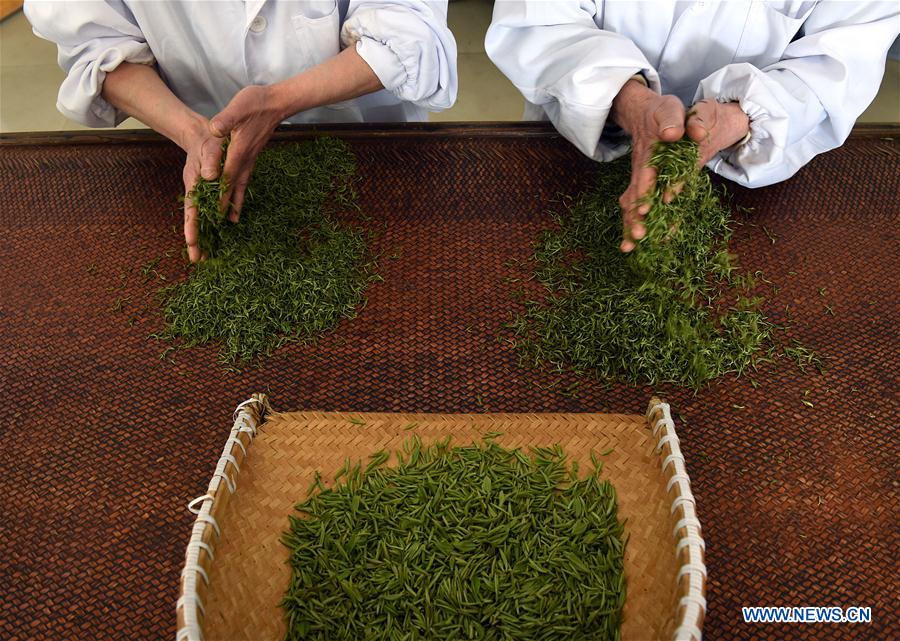 Tea makers process Yuhua tea leaves at a tea factory in Nanjing, capital of east China's Jiangsu Province, March 23, 2018. Nanjing Yuhua tea is regarded as one of the ten renowned tea categories in China. (Xinhua/Sun Can)