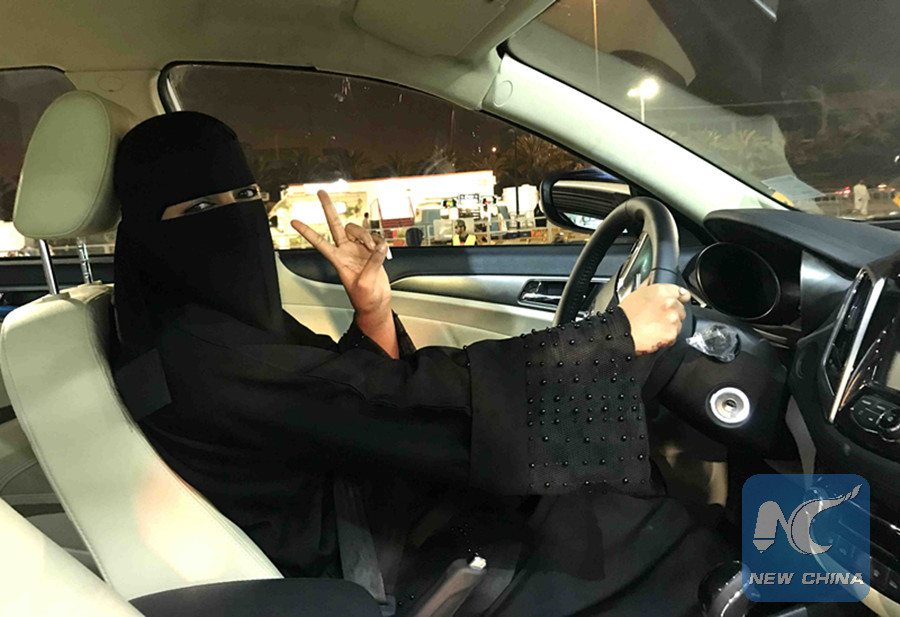RIYADH, June 24 (Xinhua) -- Wearing a black robe and veil, Hanan Azmi drove her black Cadillac for the first time along the Tahalia Street in the Saudi Arabian capital Riyadh.