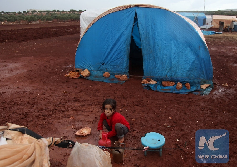 A displaced Syrian child poses for a photograph in a flooded refugee camp in the Idlib countryside, northwestern Syria, on Oct. 25, 2018. (Xinhua/AFP)