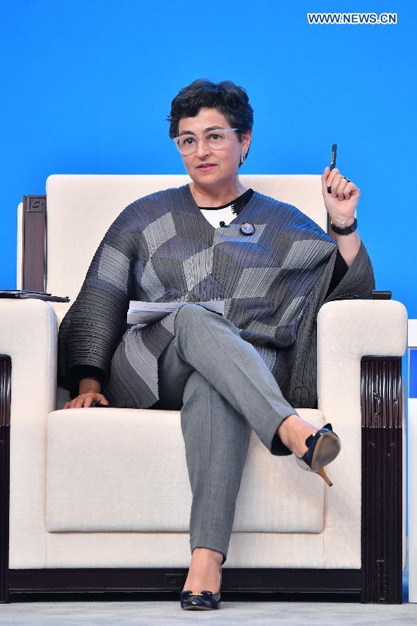 Arancha Gonzalez, executive director of International Trade Centre, presides over a discussion at the Parallel Session on Trade and Investment of the Hongqiao International Economic and Trade Forum in Shanghai, east China, Nov. 5, 2018.(Xinhua/Li Xin)