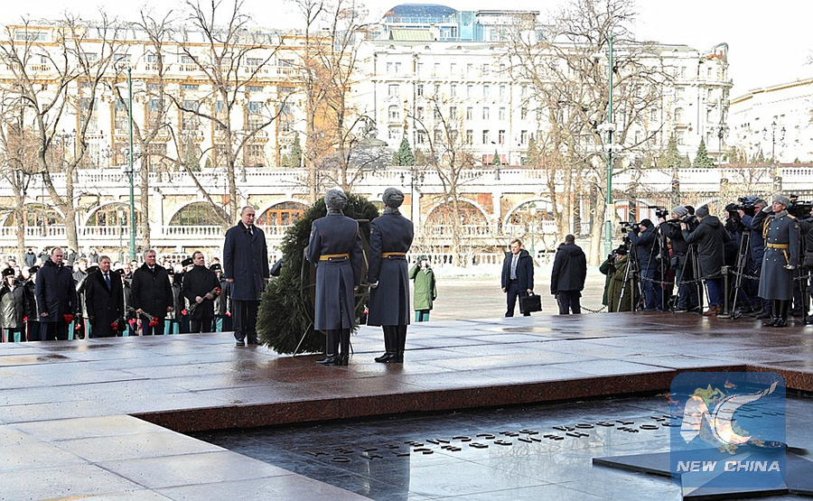 MOSCOW, Feb. 23 (Xinhua) -- Russian President Vladimir Putin laid a wreath at the Tomb of the Unknown Soldier by the Kremlin wall on Saturday to honor Soviet soldiers killed during World War II.