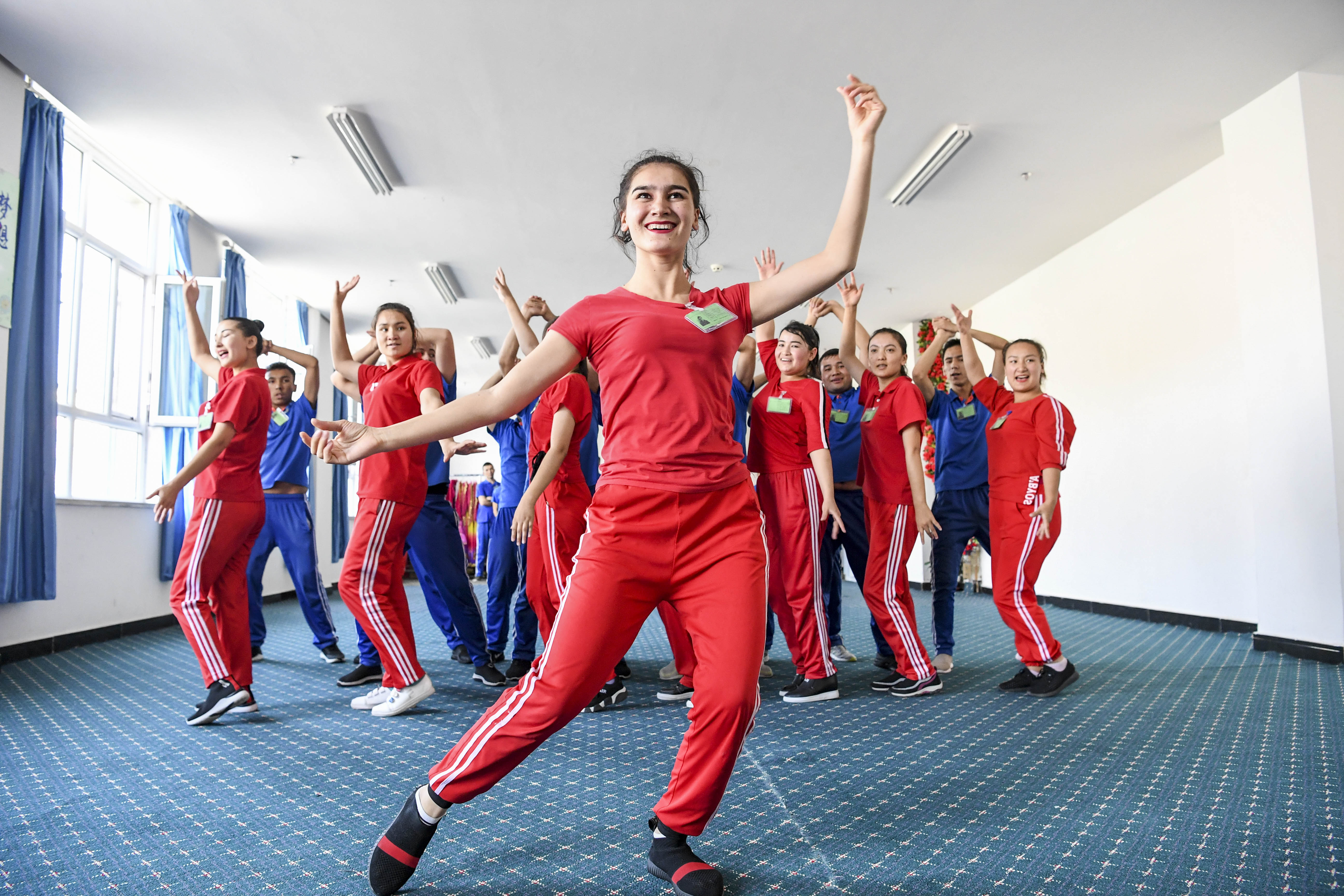 Trainees dance in spare time at the vocational education and training center in Hotan county of Hotan Prefecture, northwest China's Xinjiang Uygur Autonomous Region, Oct. 7, 2018. (Xinhua/Hu Huhu)