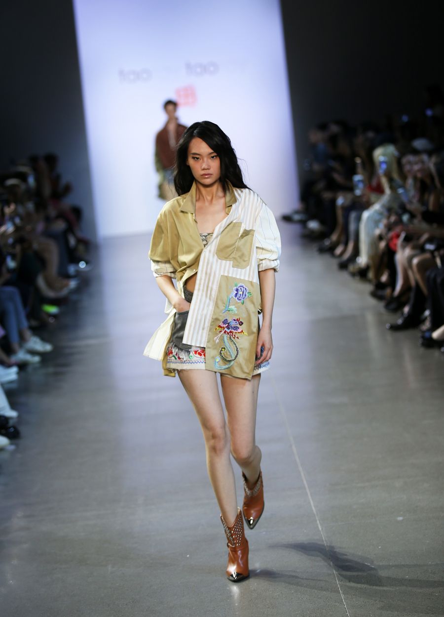 A model presents a creation from Taoray Taoray Spring/Summer 2020 collection during the New York Fashion Week in New York, the United States, on Sept. 11, 2019. (Xinhua/Qin Lang)