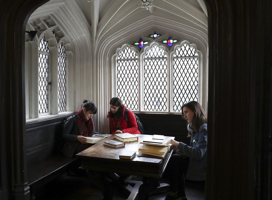 People read books by the oak desk in Chetham's Library in Manchester, Britain, April 16, 2018. (Xinhua/Han Yan)