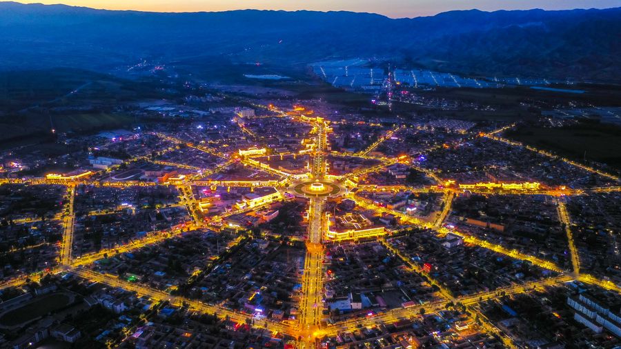 Aerial photo taken on Aug. 12, 2019 shows a night view of Tekes County in northwest China's Xinjiang Uygur Autonomous Region. (Xinhua/Hu Huhu)