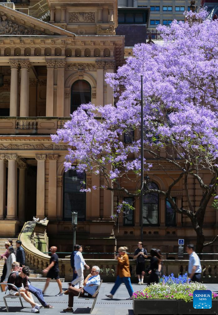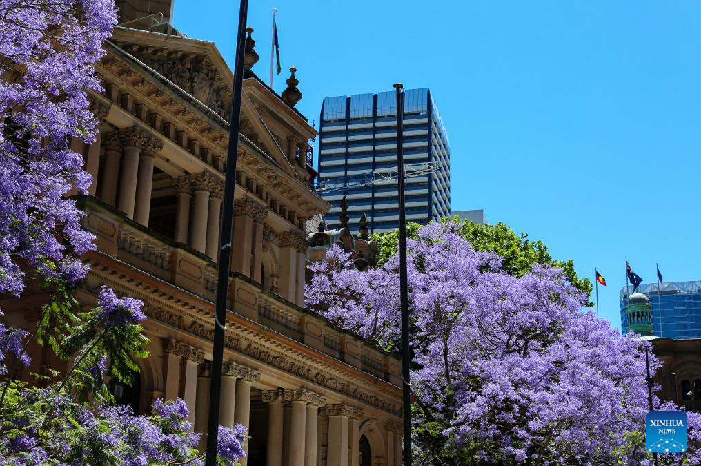 This photo taken on Nov. 5, 2025 shows blooming jacaranda outside the Town Hall in Sydney, Australia. (Xinhua/Ma Ping)