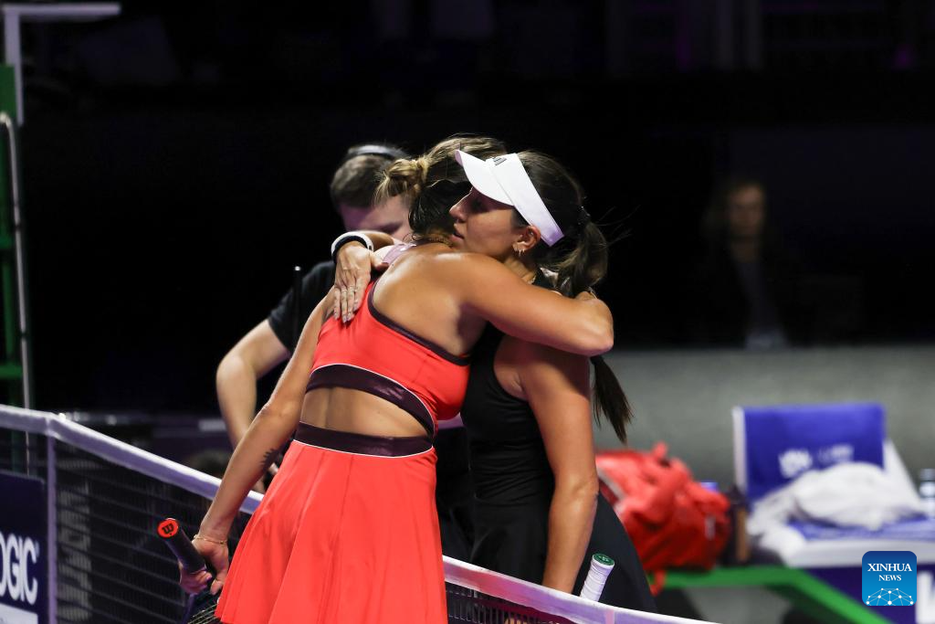 Aryna Sabalenka of Belarus and Jessica Pegula (R) of the United States hug after their round robin match at WTA Finals tennis tournament in Riyadh, Saudi Arabia, on Nov. 4, 2025. (Xinhua/Luo Chen)