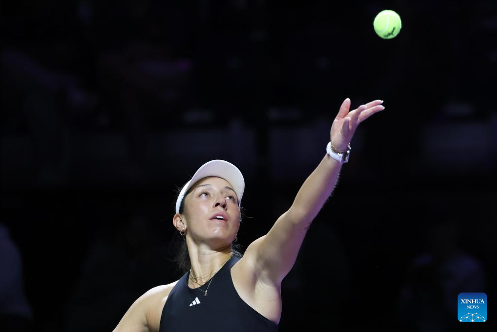 Jessica Pegula of the United States serves during the round robin match against Aryna Sabalenka of Belarus at WTA Finals tennis tournament in Riyadh, Saudi Arabia, on Nov. 4, 2025. (Xinhua/Luo Chen)