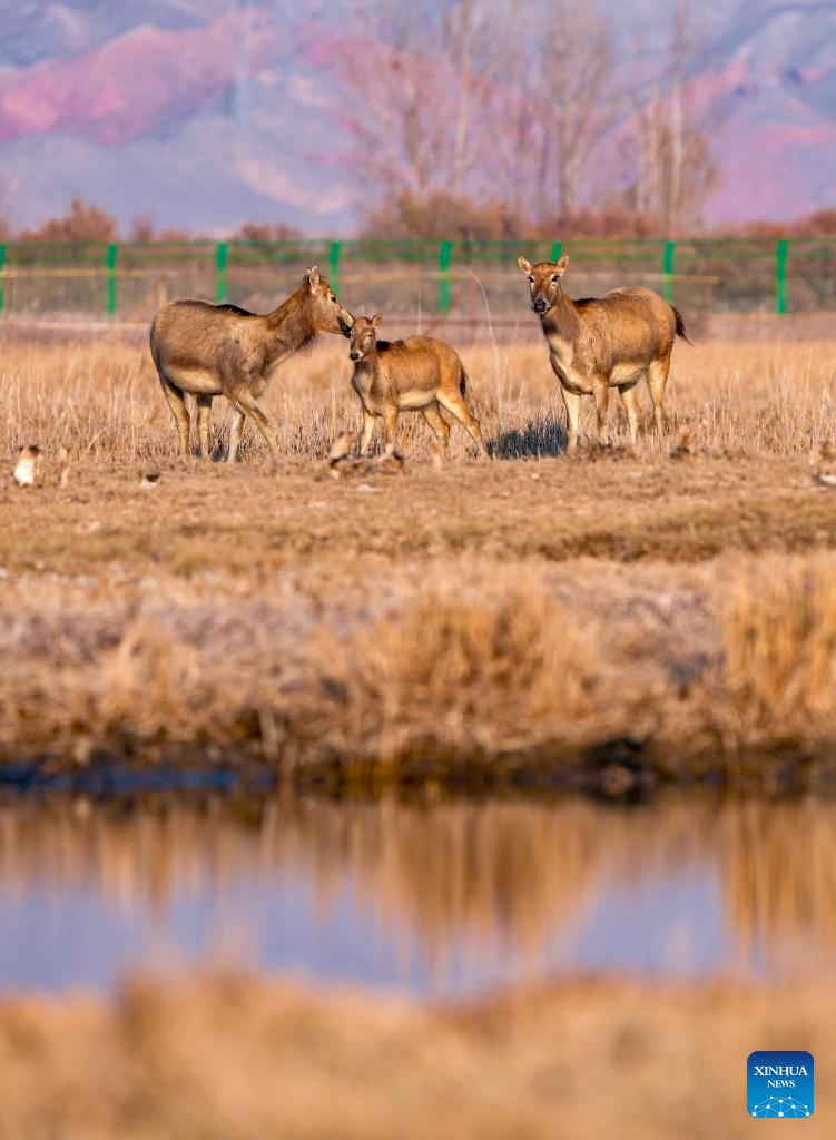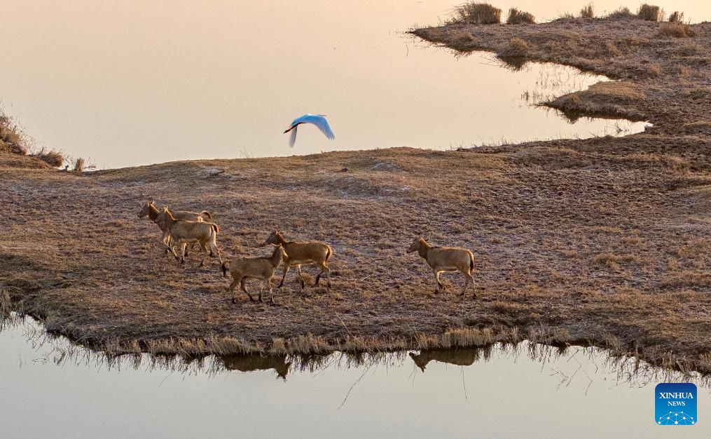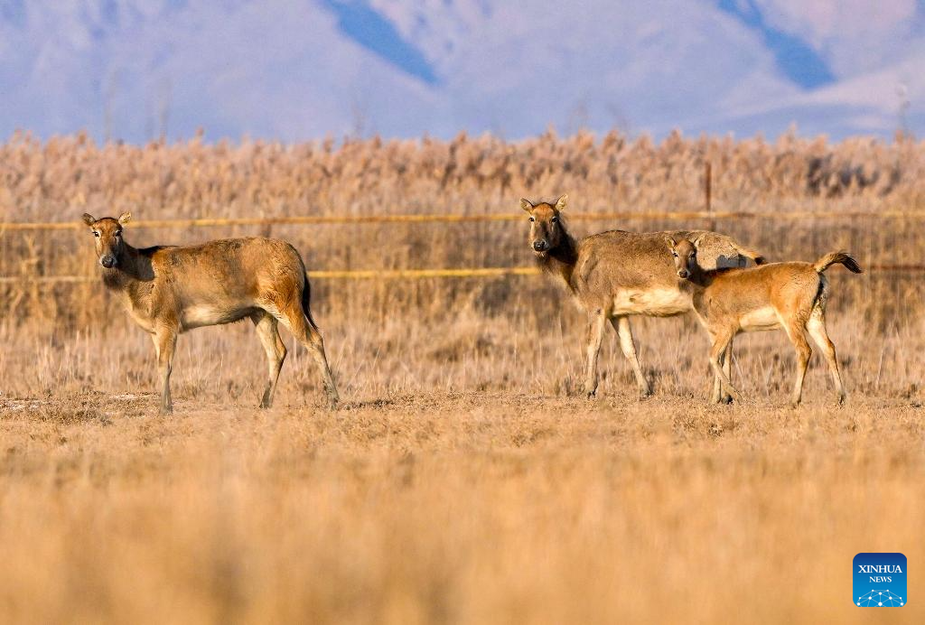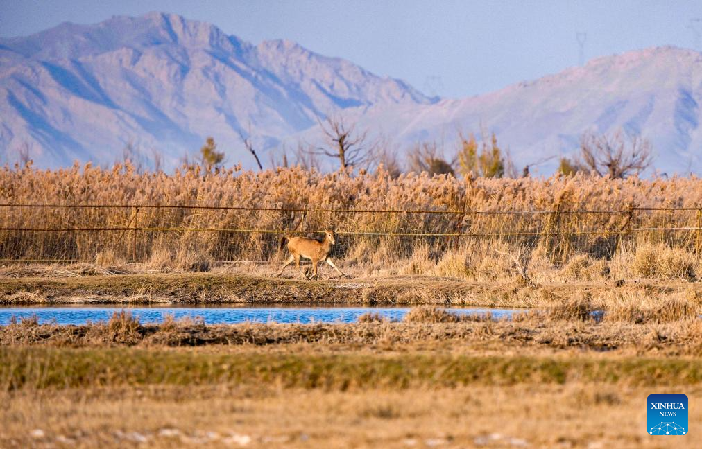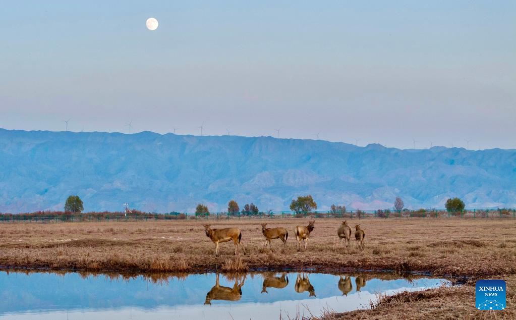 Milu deer are pictured at Qingtongxia Reservoir Wetland Nature Reserve, northwest China's Ningxia Hui Autonomous Region, Nov. 4, 2025. The Qingtongxia Reservoir Wetland Nature Reserve, covering a total area of 174.93 square kilometers, is the largest Yellow River tidal flat wetland in Ningxia. In September 2024, 35 milu deer were introduced to the reserve. By now, six milu deer cubs were born at the reserve. (Xinhua/Yang Zhisen)