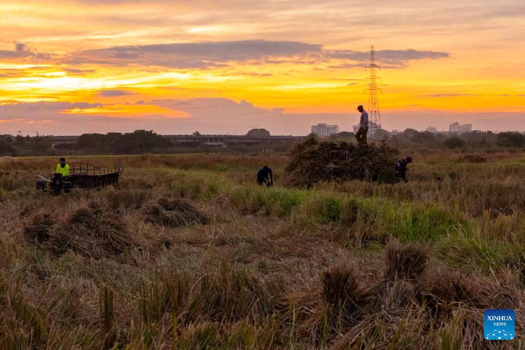 An aerial drone photo taken on Nov. 2, 2025 shows farmers harvesting rice in a rice field in Vientiane, Laos. Local farmers have recently been busy harvesting the rice as the harvest season comes. (Photo by Kaikeo Saiyasane/Xinhua)