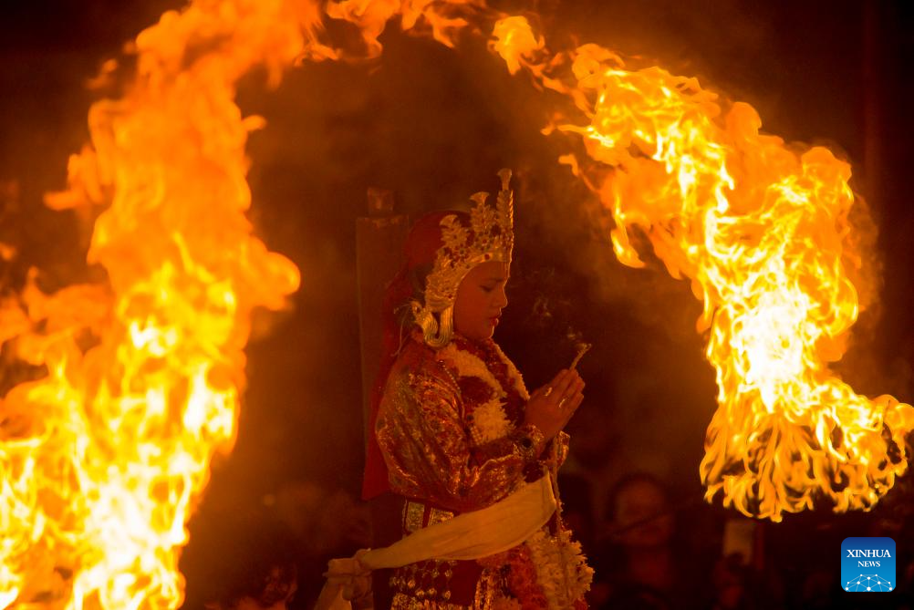 A boy in traditional attire is pictured during the Kartik Naach festival at Patan Durbar Square in Lalitpur, Nepal, Nov. 4, 2025. (Photo by Sulav Shrestha/Xinhua)