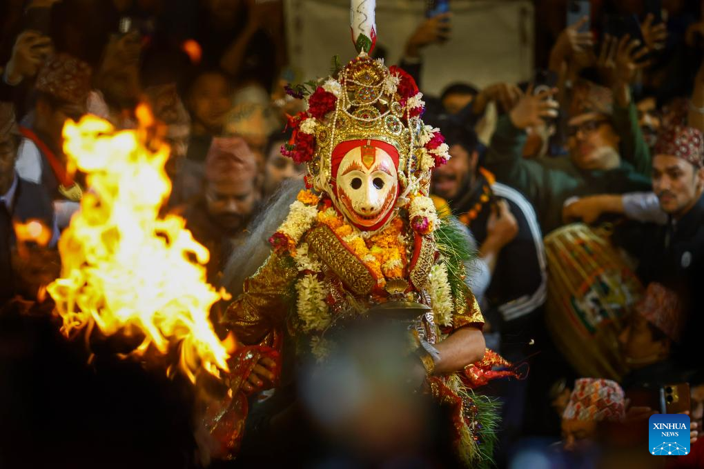 A masked performer dances during the Kartik Naach festival at Patan Durbar Square in Lalitpur, Nepal, Nov. 4, 2025. (Photo by Sulav Shrestha/Xinhua)