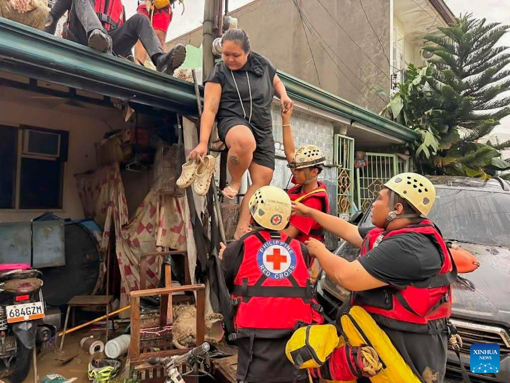 Rescuers from the Philippine Red Cross evacuate residents from their home after the flood brought by heavy rains from typhoon Kalmaegi in Cebu Province, the Philippines, on Nov. 4, 2025. Typhoon Kalmaegi has hammered the Philippines overnight on Monday, killing at least one and affecting nearly 60,000 people in the central and southern Philippines, the National Disaster Risk Reduction and Management Council (NDRRMC) said on Tuesday. (Philippine Red Cross /Handout via Xinhua)