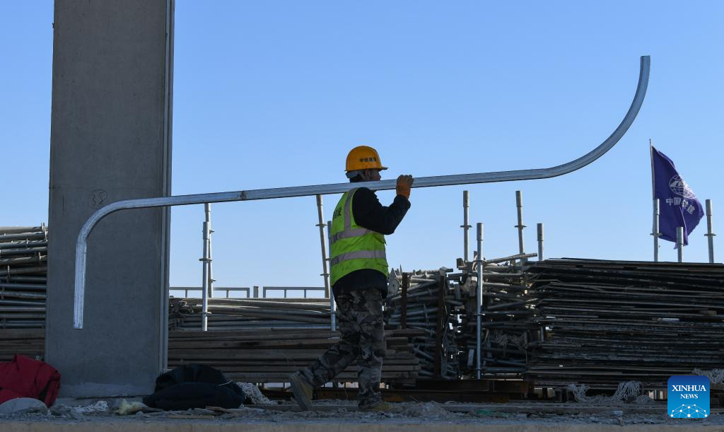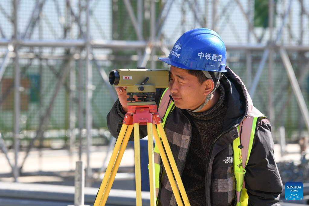 A man works at Zhouliang Station of a railway linking Beijing with the Binhai New Area of Tianjin in north China's Tianjin, Feb. 26, 2022. With a length of about 172 kilometers and a designed speed of 350 kilometers per hour, the second intercity express railway linking Beijing with the Binhai New Area of Tianjin is expected to cut travel time between the two areas to 57 minutes. (Xinhua/Sun Fanyue)
