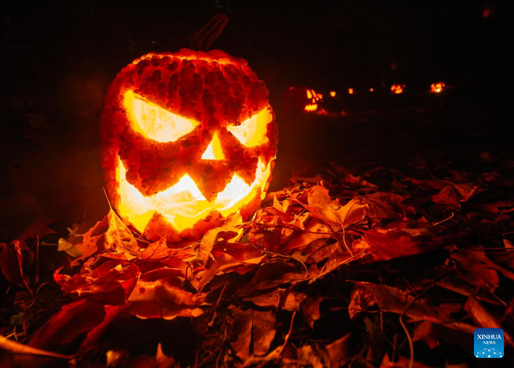 A Jack-O-Lantern is seen during a pumpkin parade event in a park in Mississauga, Ontario, Canada, on Nov. 1, 2025. (Photo by Zou Zheng/Xinhua)