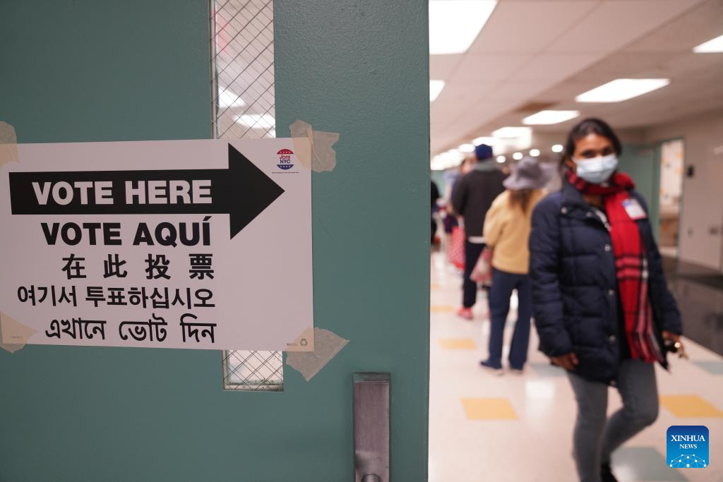 A sign pointing to a polling station is seen in Queens, New York City, the United States, on Nov. 4, 2025. The New York City mayoral election took place on Tuesday. (Xinhua/Zhang Fengguo)
