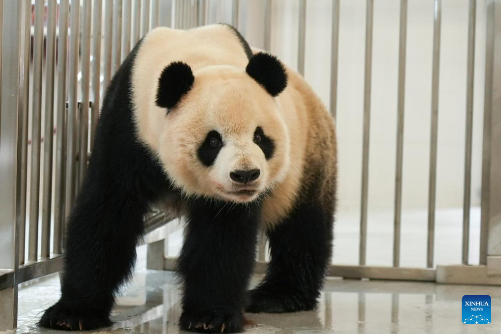 A giant panda moves into an enclosure at the Mianyang base of China Conservation and Research Center for the Giant Panda in Mianyang City, southwest China's Sichuan Province, on Nov. 4, 2025. The Mianyang base of China Conservation and Research Center for the Giant Panda, which took three years to build, was put into trial operation on Tuesday. Thirteen pandas from Wolong Shenshuping and Dujiangyan bases of China Conservation and Research Center for the Giant Panda moved into their new home at the newly opened Mianyang base on the day.