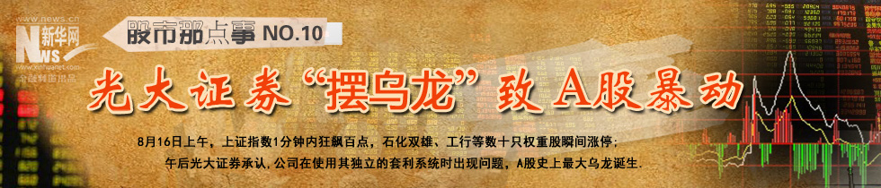 | 繼光大證券“烏龍”事件以來,公司兩項(xiàng)業(yè)務(wù)已被暫停。上海證監(jiān)局要求光大證券策略投資部證券自營(yíng)業(yè)務(wù)從8月19日開始暫停三個(gè)月,中國(guó)銀行間市場(chǎng)交易商協(xié)會(huì)要求暫停光大證券公司非金融企業(yè)債務(wù)融資工具主承銷業(yè)務(wù)。光大證券8月20日復(fù)牌首日一字跌停,在集合競(jìng)價(jià)階段被逾122萬手賣單封死在跌停板,報(bào)收10.91元;8月21日跌5.87%,報(bào)收10.27元。復(fù)牌兩日光大證券市值蒸發(fā)達(dá)63.2億元。 |