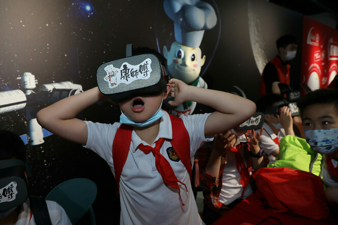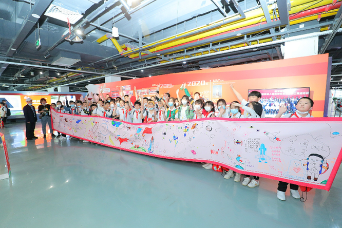 在現場,為了慶祝這場期待已久的航天科普展開幕,孩子們用一份“特別的禮物”——一幅繪滿了航天夢想與武漢名勝的5米長卷獻禮中國航天。在這幅長卷上,孩子們不僅生動地描繪出了武漢的眾多名勝特色,還用天馬行空的想象力展現了自己的航天夢。展區內,孩子們在講解員的帶領下參觀形形色色的“國之重器”,了解中國航天發展史,并且通過VR等設備親自體驗了一把“太空旅行”。在航天夢想體驗營中,孩子們一起回顧了空間站發射的精彩瞬間,當看到“長五B”成功升空時,現場爆發出熱烈的歡呼和掌聲,加油聲此起彼伏,許多孩子還合唱《明天會更好》對中國航天獻上祝福。
