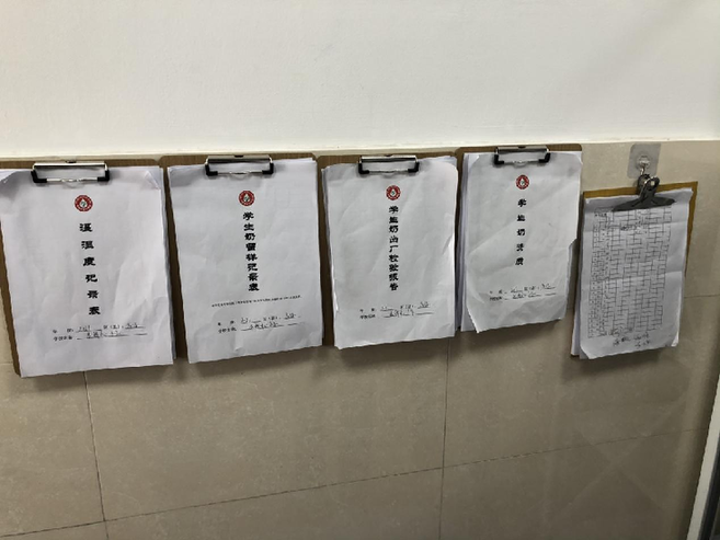 在這些學校的儲藏室里,學生奶都按照產品底層墊托板、四周離墻、離地15cm以上等嚴格要求擺放儲存。學校的墻上還掛著關于學生奶的儲存、領取與分發(fā)、不適反應處理流程等規(guī)章制度。