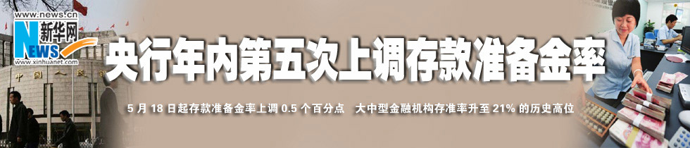 央行12日晚間宣布,從5月18日起,上調存款準備金率0.5個百分點。這是央行年內第五次上調存款準備金率,也是去年以來第十一次上調。本次上調大約可鎖定商業銀行3700億元資金。 [詳細]