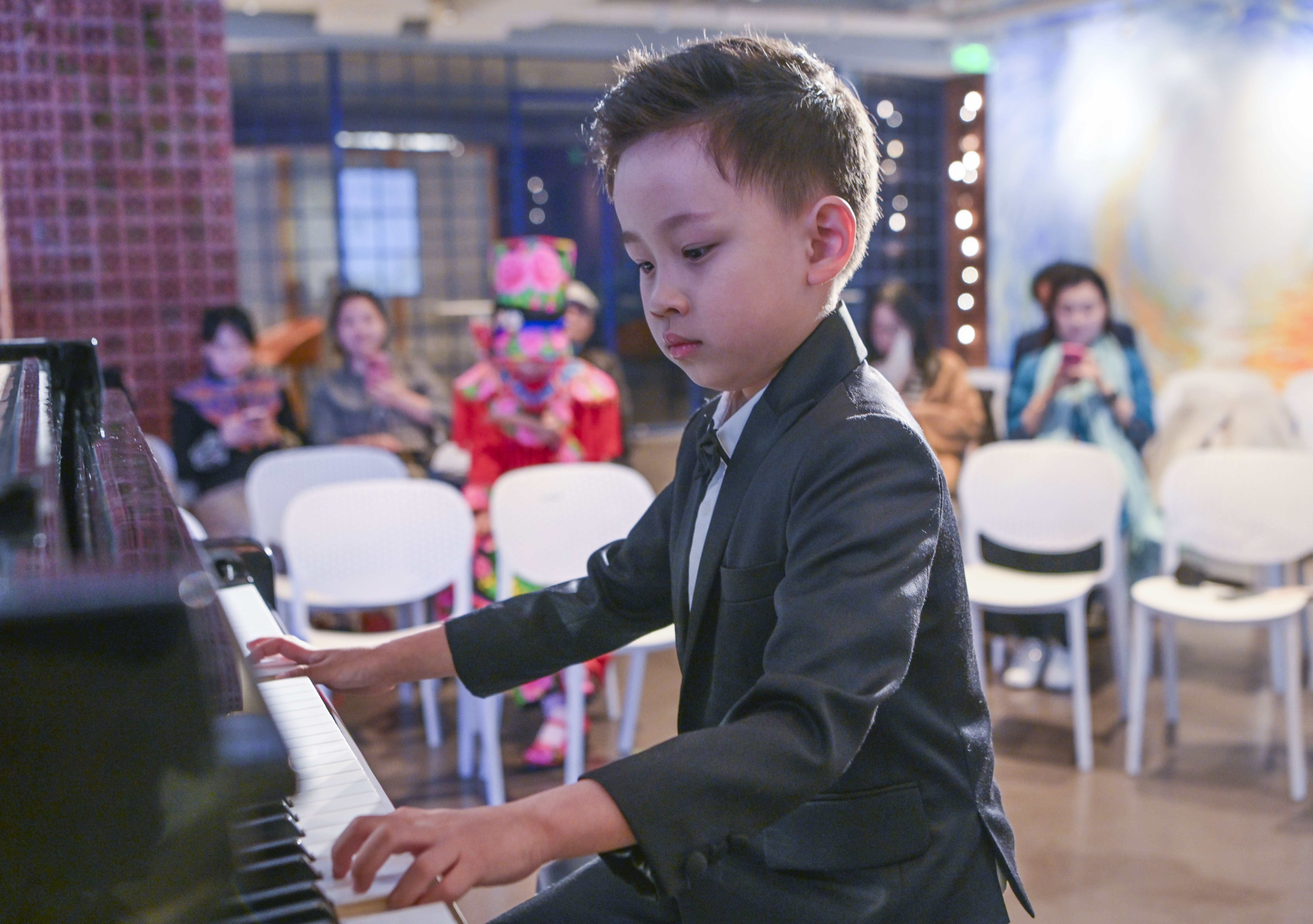 除了成年朗诵者外,本次诗会还邀请了16名小朋友以朗诵、合唱与器乐演奏的方式登台,用他们的方式理解、表达诗意。小表演者张周行演奏了肖邦《A小调圆舞曲》,他带着稚嫩的声音说:“肖邦被称为‘钢琴诗人’,他用跳动的音符表达内心的情感,非常动人。”“明月几时有,把酒问青天。”维童之友合唱团的14名儿童用“英文朗诵+中文演唱”的形式呈现作品《明月几时有》。指导教师张嘉琦介绍说,音乐被誉为“无国界的语言”,希望用这种创新的表达打破隔阂,让古典诗词拥有新层次,也让外国友人更容易体会其中的意境。