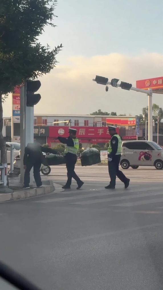 網(wǎng)友拍下溫暖一幕,輔警為駝背老人挑起擔子